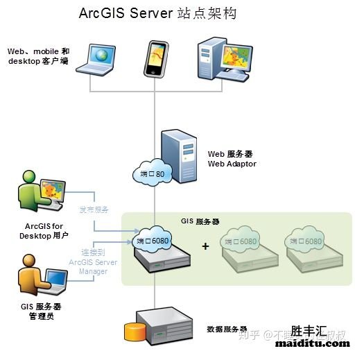 ArcGIS Server的管理由ArcGIS Desktop负责,后者可以通过局域网或Internet来访问ArcGIS Server。