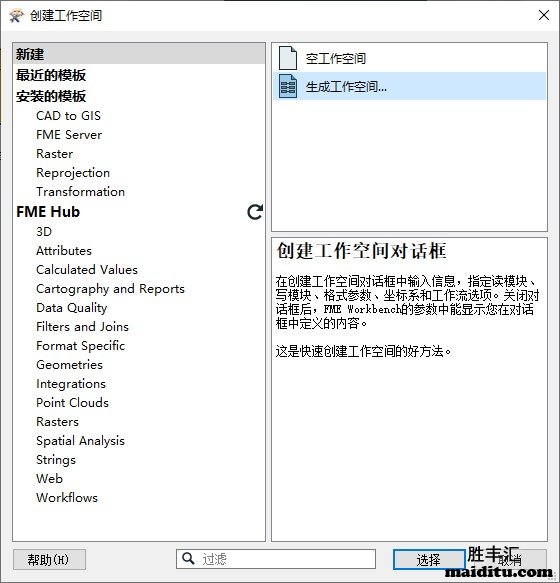 1.首先打开fme软件,点击左上角的 “创建工作空间”按钮,点击“生成工作空间”