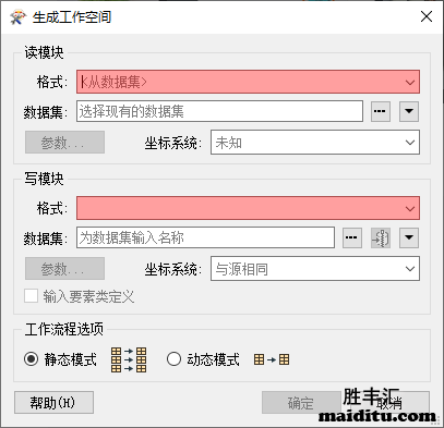 2.点击“选择”按钮,点击选择“读模块”,即源数据格式,然后点击“数据集",选择要转换的数据。”写模块"即需要转换为的格式和文件路径。
